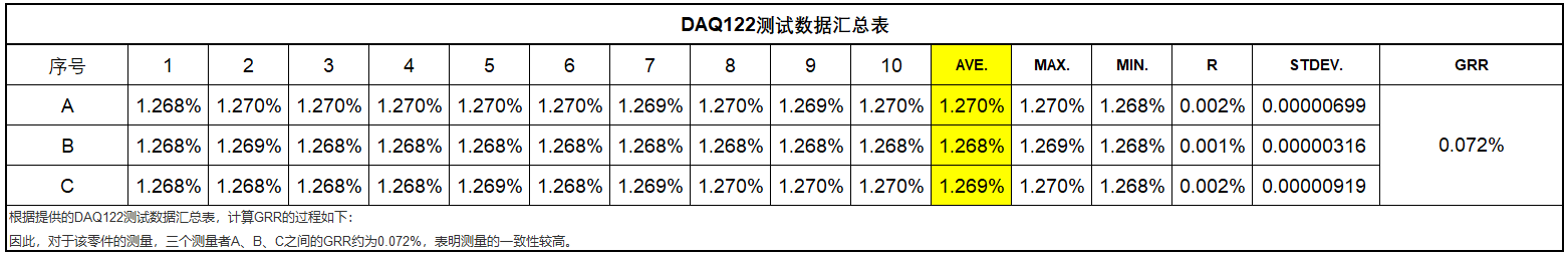 ရွေးချယ်ထားသောဒေတာရယူခြင်းကတ်သည် လိုအပ်ချက်များနှင့်ကိုက်ညီကြောင်းသေချာစေရန် ME အဖွဲ့သည် ၎င်းကိုစမ်းသပ်ခဲ့သည်။ ခွဲခြမ်းစိတ်ဖြာချက်တွင် ရွေးချယ်ထားသော ဒေတာရယူမှုကတ်သည် ကောင်းမွန်သောတည်ငြိမ်မှုရှိပြီး တိုင်းတာမှု A၊ B နှင့် C တို့တွင် ခန့်မှန်းခြေ GRR 0.072% ရှိကြောင်း ပြသသည်။