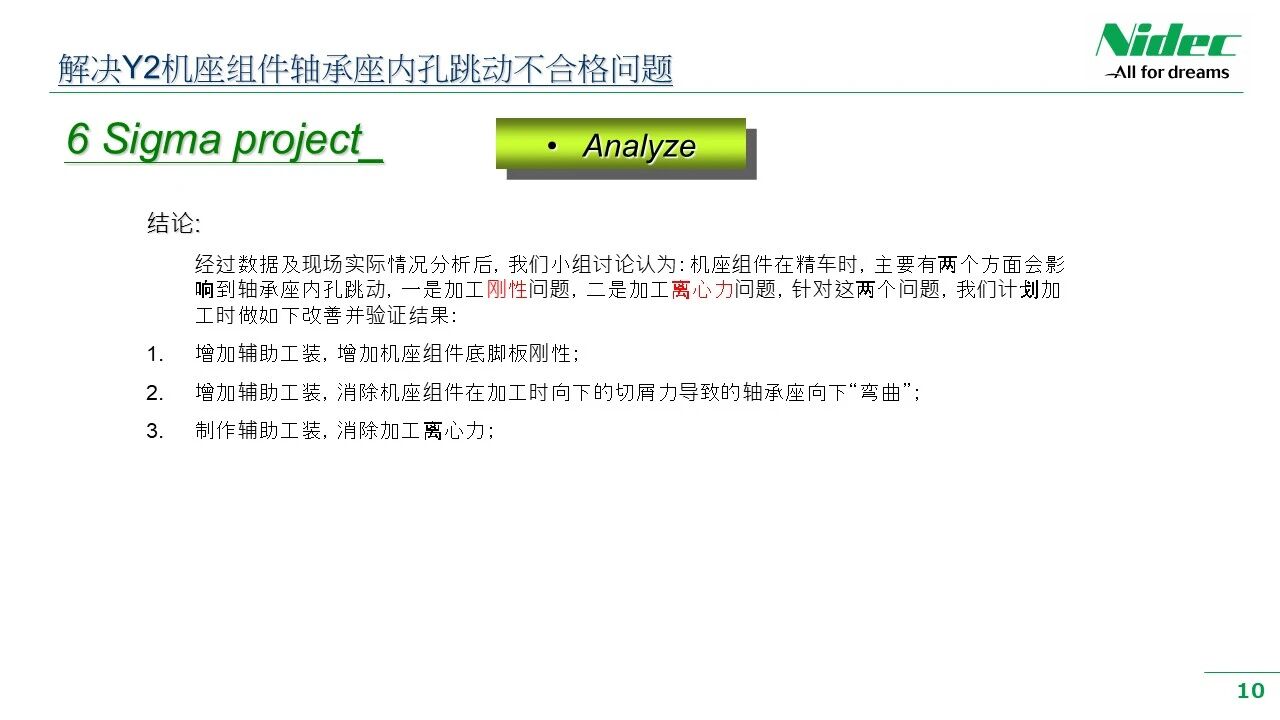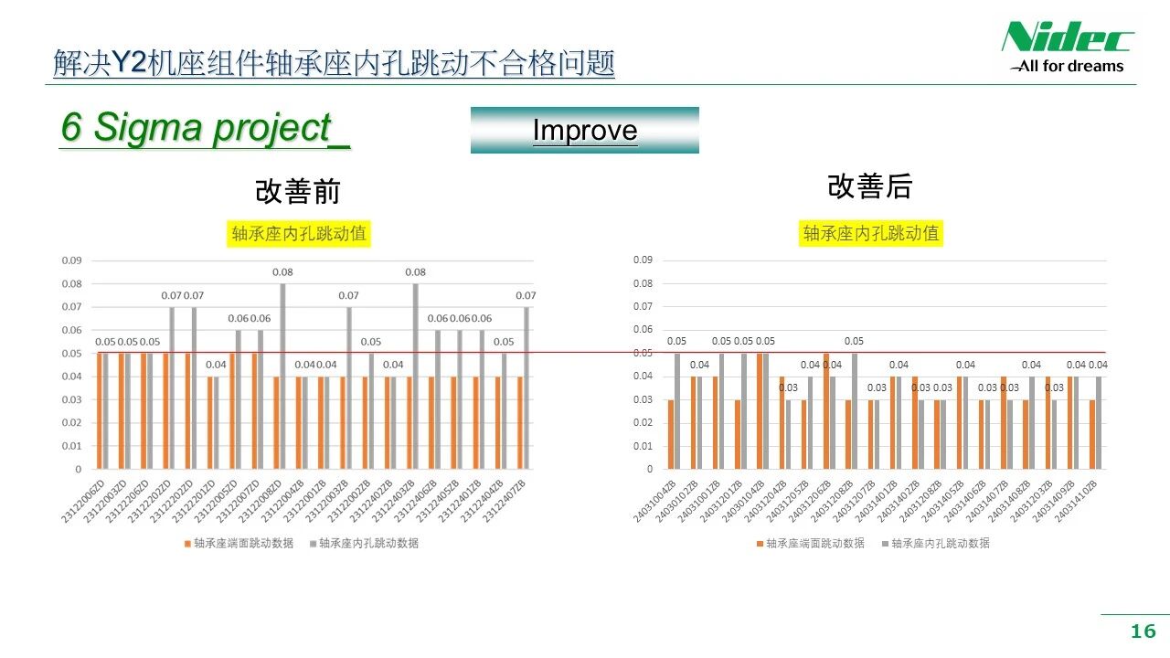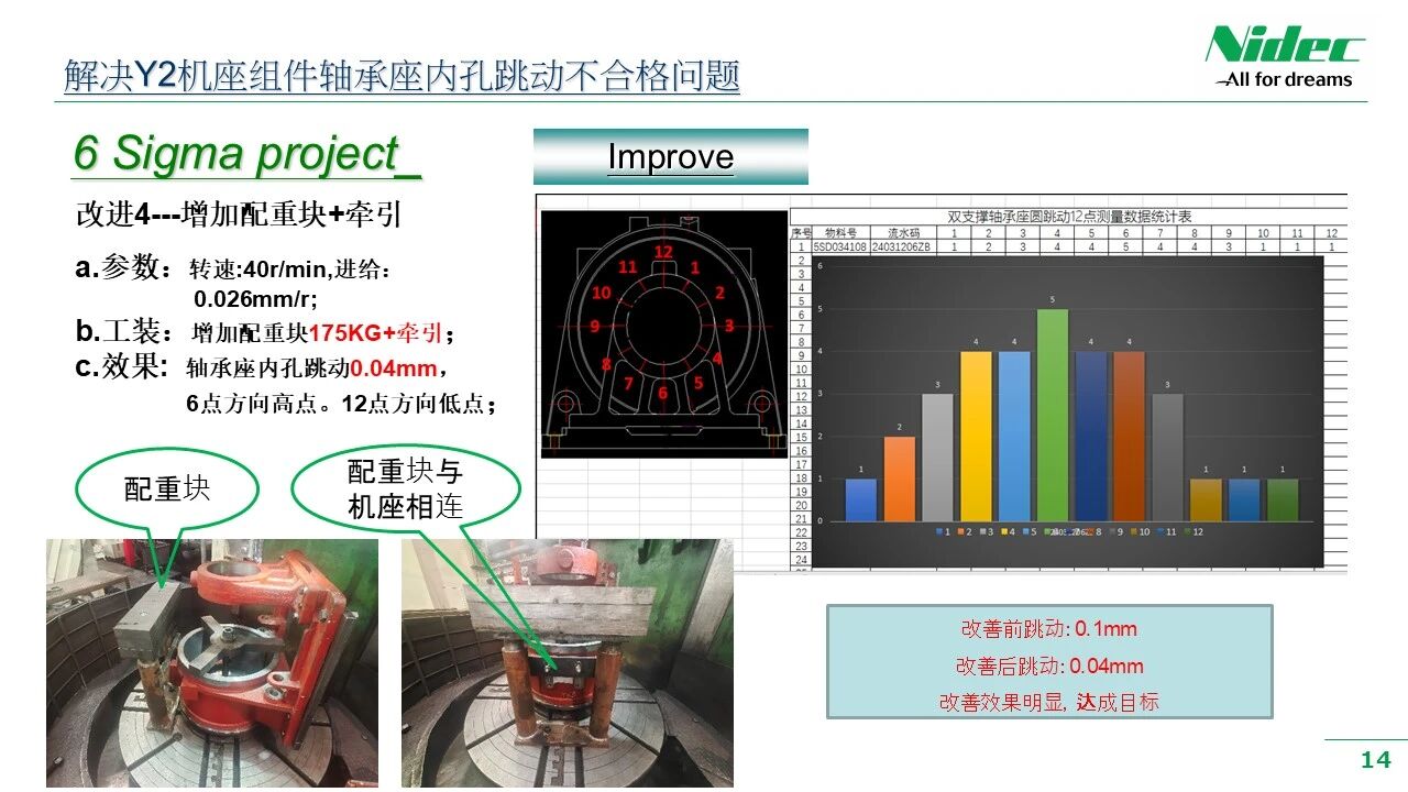 ခွဲခြမ်းစိတ်ဖြာခြင်းနှင့်စစ်ဆေးခြင်း၏ရလဒ်များကို အခြေခံ. အဖွဲ့သည်ပစ်မှတ်ထားသောဖြေရှင်းနည်းများကိုအဆိုပြုထားသည်။ ၎င်းတွင်လုပ်ငန်းစဉ်အပေါ်အကောင်းမြင်ခြင်း, နည်းပညာအဆင့်မြှင့်တင်ခြင်း, အမှန်တကယ်စစ်ဆင်ရေးတွင်မျှော်လင့်ထားသည့်ရလဒ်များကိုထုတ်လုပ်နိုင်ရန်အတွက်အဖွဲ့အနေဖြင့်ဖြေရှင်းနည်းများ၏ထိရောက်မှုကိုအတည်ပြုရန်အရေးကြီးသည်။ စစ်ဆေးမှုအောင်မြင်သည်နှင့်တပြိုင်နက်အဖွဲ့သည်လုပ်ငန်းစဉ်အသစ်များကိုစံသတ်မှတ်ခြင်းလုပ်ငန်းစဉ်တစ်လျှောက်လုံးတွင်တိုးတက်မှုရလဒ်များကိုမြှင့်တင်နိုင်ရန်အတွက်လုပ်ငန်းစဉ်ဖော်ပြချက်နှင့်လုပ်ငန်းခွင်များကိုအဆင့်မြှင့်တင်လိမ့်မည်။ ဥပမာအားဖြင့်, Y2 စီးရီးစက်အခြေစိုက်စခန်းစည်းဝေးပွဲ၏ runout ပြ problem နာကိုဖြေရှင်းသည့်အခါကျွန်ုပ်တို့၏အဖွဲ့သည်ခွဲခြမ်းစိတ်ဖြာသည့်အဆင့်တွင်ဆန်းစစ်ခြင်း၏ရလဒ်များအပေါ် အခြေခံ. ပစ်မှတ်ထားသောဖြေရှင်းနည်းများကိုအဆိုပြုထားသည်။ ဤဖြေရှင်းချက်များတွင်ဆိုင်းငံ့ထားသည့်နေရာ၏ဆိုင်းငံ့ထားသောနေရာ၌ပံ့ပိုးမှုအချက်များထည့်သွင်းခြင်း, ထို့နောက်စမ်းသပ်ခြင်းဆိုင်ရာစစ်ဆေးမှုအချက်အလက်များသည်အသင်း၏မျှော်လင့်ထားသည့်ရည်မှန်းချက်များနှင့်ပြည့်မီပြီးနောက်ဆုံးတွင်ထိရောက်သောဖြေရှင်းချက်ကိုအတည်ပြုရန်စစ်ဆေးမှုပြုလုပ်သောစစ်ဆေးမှုများကိုတစ်ခုကပြုလုပ်ခဲ့သည်။