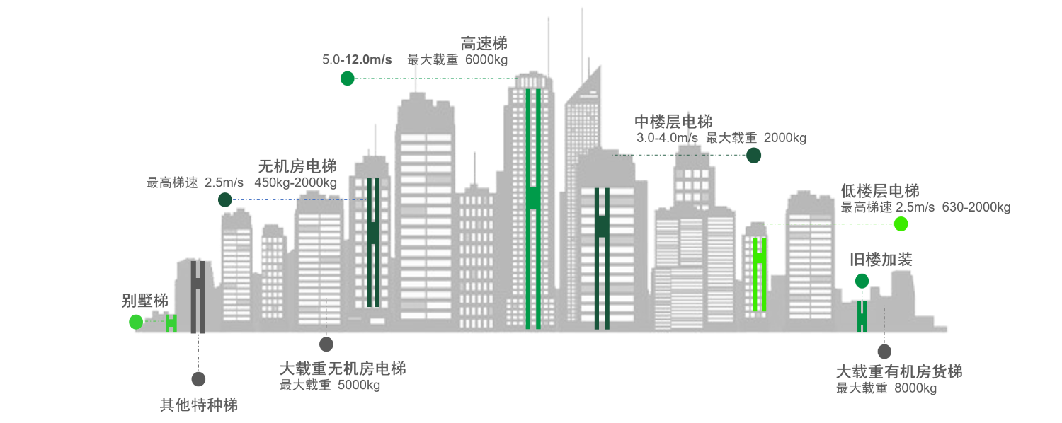 ကျွန်ုပ်တို့သည် အမြင့်ဆုံးဝန်ပမာဏ 6000 ကီလိုဂရမ် (2:1 အချိုး) နှင့် အမြင့်ဆုံးအမြန်နှုန်း 12m/s (1:1 အချိုး) ရှိသော လျှောက်လွှာအခြေအနေများအတွက် သင့်လျော်သော ဆွဲငင်စက်များနှင့် ကိုက်ညီသည့် ပင်မဖရိမ်များကို ပေးဆောင်ထားပါသည်။ ဖောက်သည်များသည် ဓာတ်လှေကားဘောင်ဘောင်များအလိုက် သင့်လျော်သောမော်ဒယ်များကို တိုက်ရိုက်ရွေးချယ်နိုင်ပြီး ဒီဇိုင်းစက်ဝန်းကို သိသိသာသာတိုစေပါသည်။